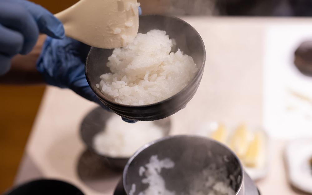 当店のお米は、オーナーの知人である農家が丹精込めて育てた広島県産銘柄米「あきろまん」を使用しております。玄米のまま仕入れ、姉妹店で精米したてを一組ずつ丁寧に釜炊きでご提供。ふっくらと立ち上る香りと、口いっぱいに広がる自然な甘みをお楽しみいただけます。